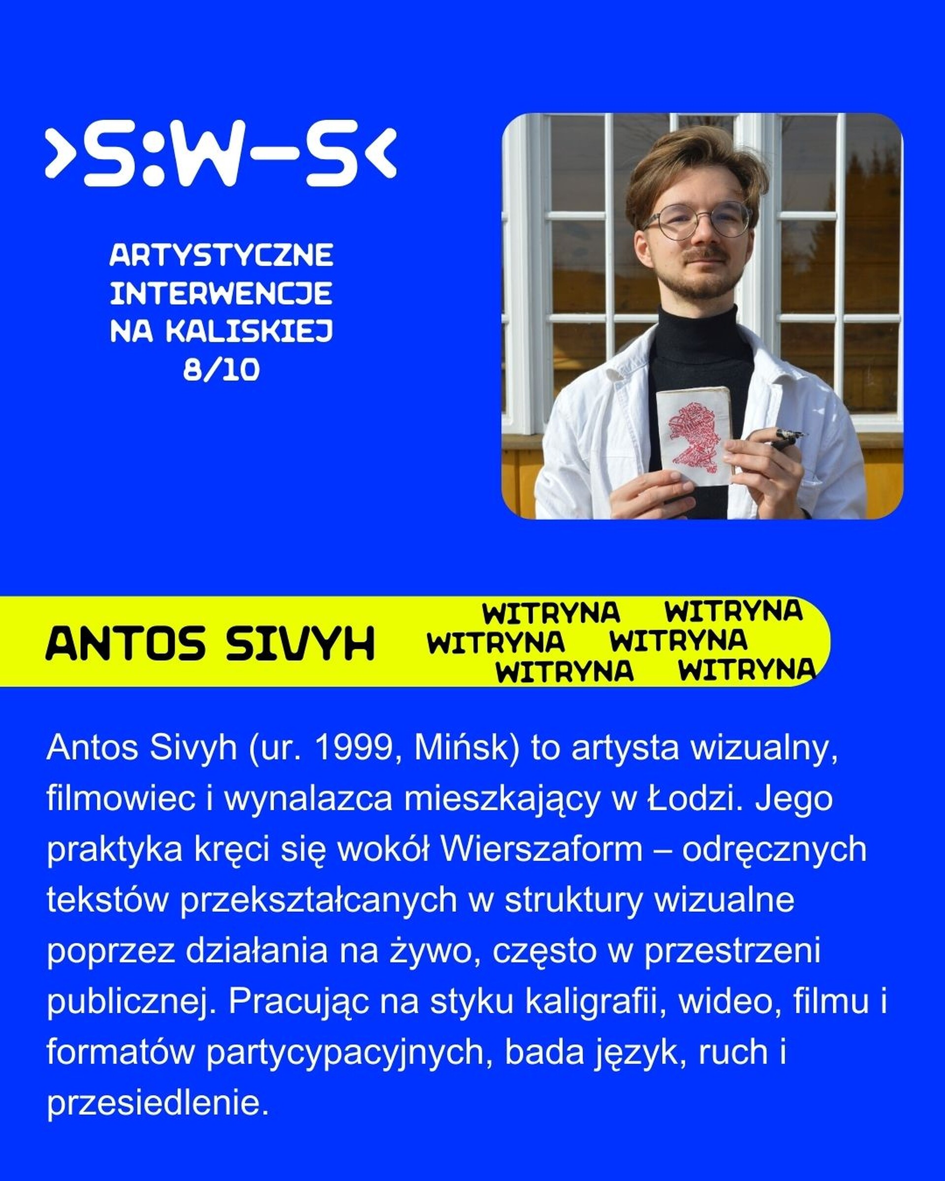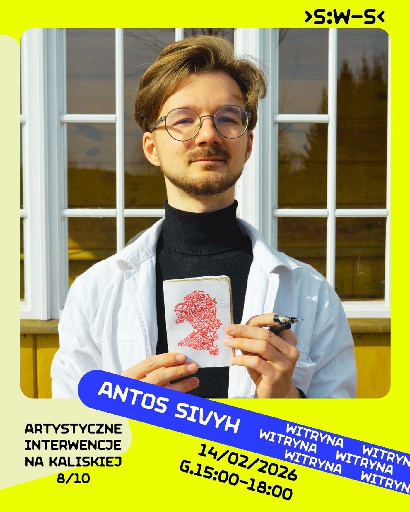 A potem będzie można wziąć udział w otwartym warsztacie pisma wizualnego i Wierszaform. Antos Sivyh podzieli się z nami swoją metodą twórczą i pokaże, jak (i dlaczego) zamieniać słowa w formę, jak używać rytmu, skali i ciszy. Stworzymy własne Wierszaformy: część będzie można zabrać ze sobą, a część trafi do naszego okna. Wierszaformy mają łączyć ludzi, nieść ciepło i pomagać opowiadać o własnym doświadczeniu.